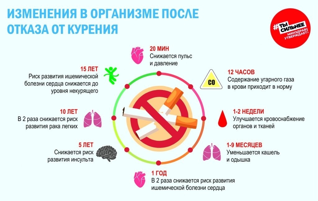 Уже через 20 минут после последней сигареты нормализуется пульс и артериальное давление. Спустя 8 часов уровень угарного газа в крови возвращается к норме, что улучшает снабжение тканей кислородом.